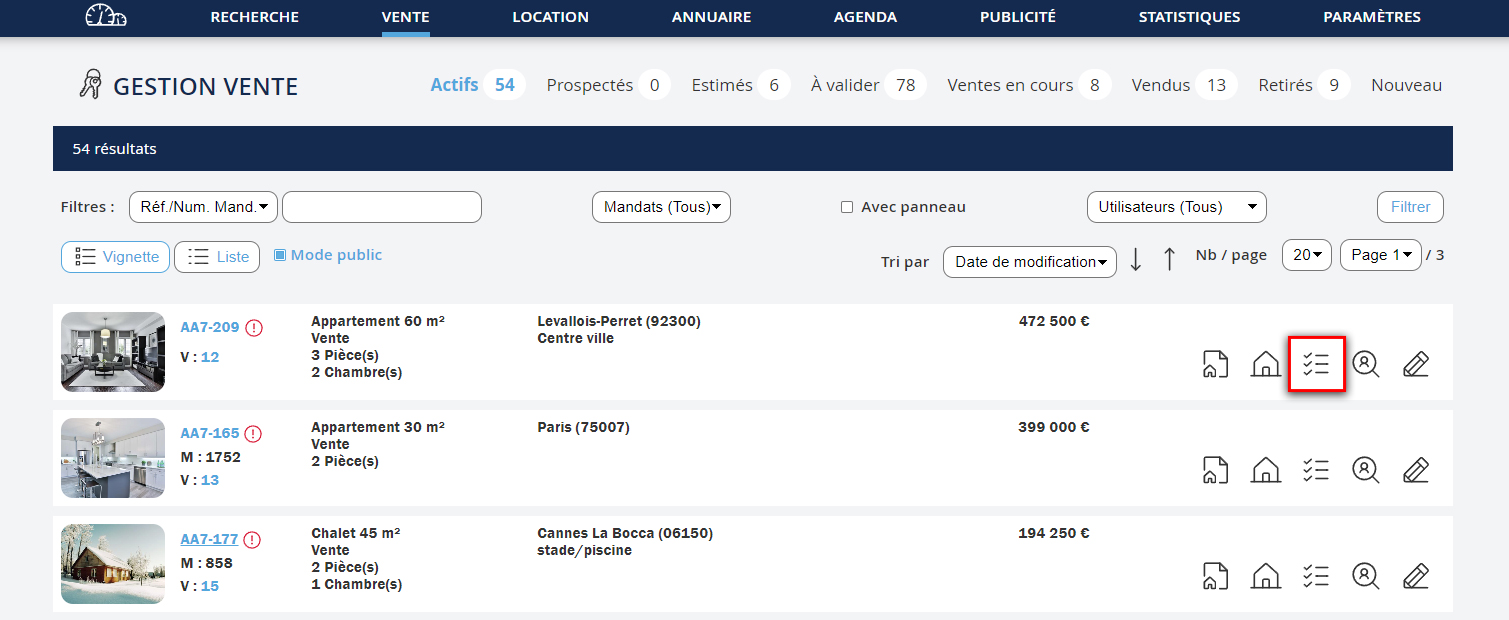 - Cliquez sur "Vente" ou "Location" dans le menu