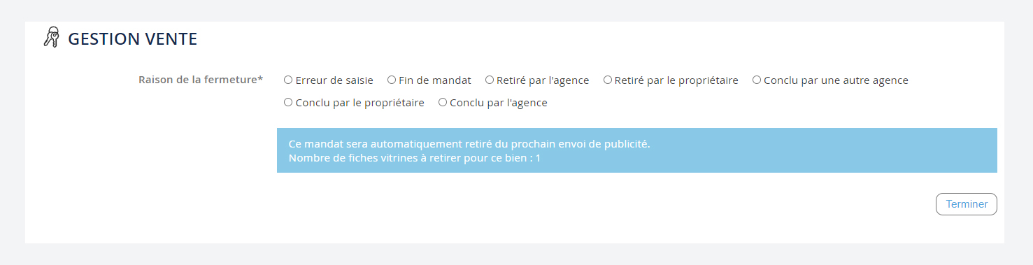 - Pour finaliser votre action, vous devez sélectionner un motif - Selon le motif sélectionné, vous verrez différents champs apparaître. NB : Ces informations sont importantes pour améliorer le calcul de vos prochaines estimations. A propos de l’archivage d’un mandat : - Si vous remplissez la Date de vente, alors le Montant de la vente et le Prix net vendeur deviennent des informations obligatoires. Par conséquent, s’il vous manque une de ces informations ne renseignez pas les autres. - Un mandat archivé reste accessible dans le sous menu Retirés. - Le calcul des estimations du logiciel, est programmé à partir des informations sur les biens actifs ainsi que les biens archivés. Cf chapitre Faire une estimation.