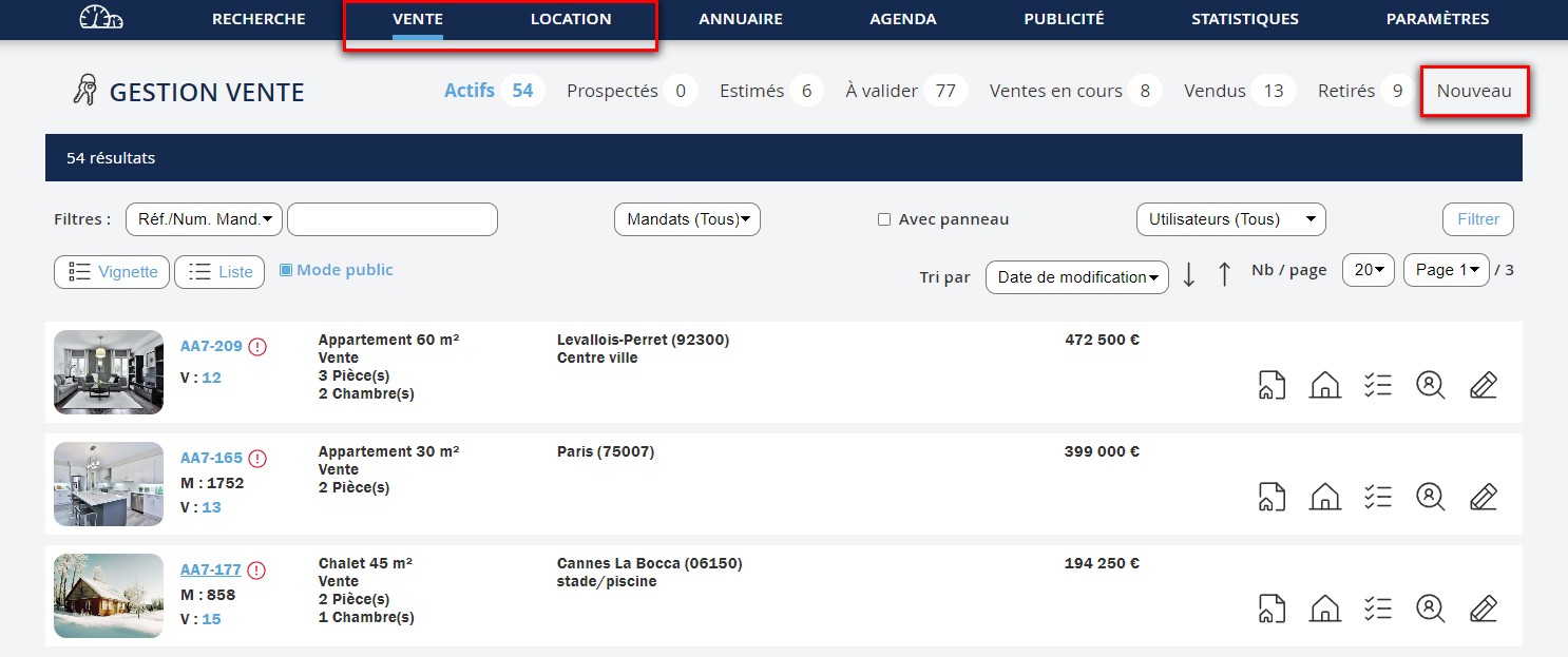 1. Dans le menu, cliquer sur "Vente" ou "Location". 2. Dans le sous-menu, cliquer sur "Nouveau".