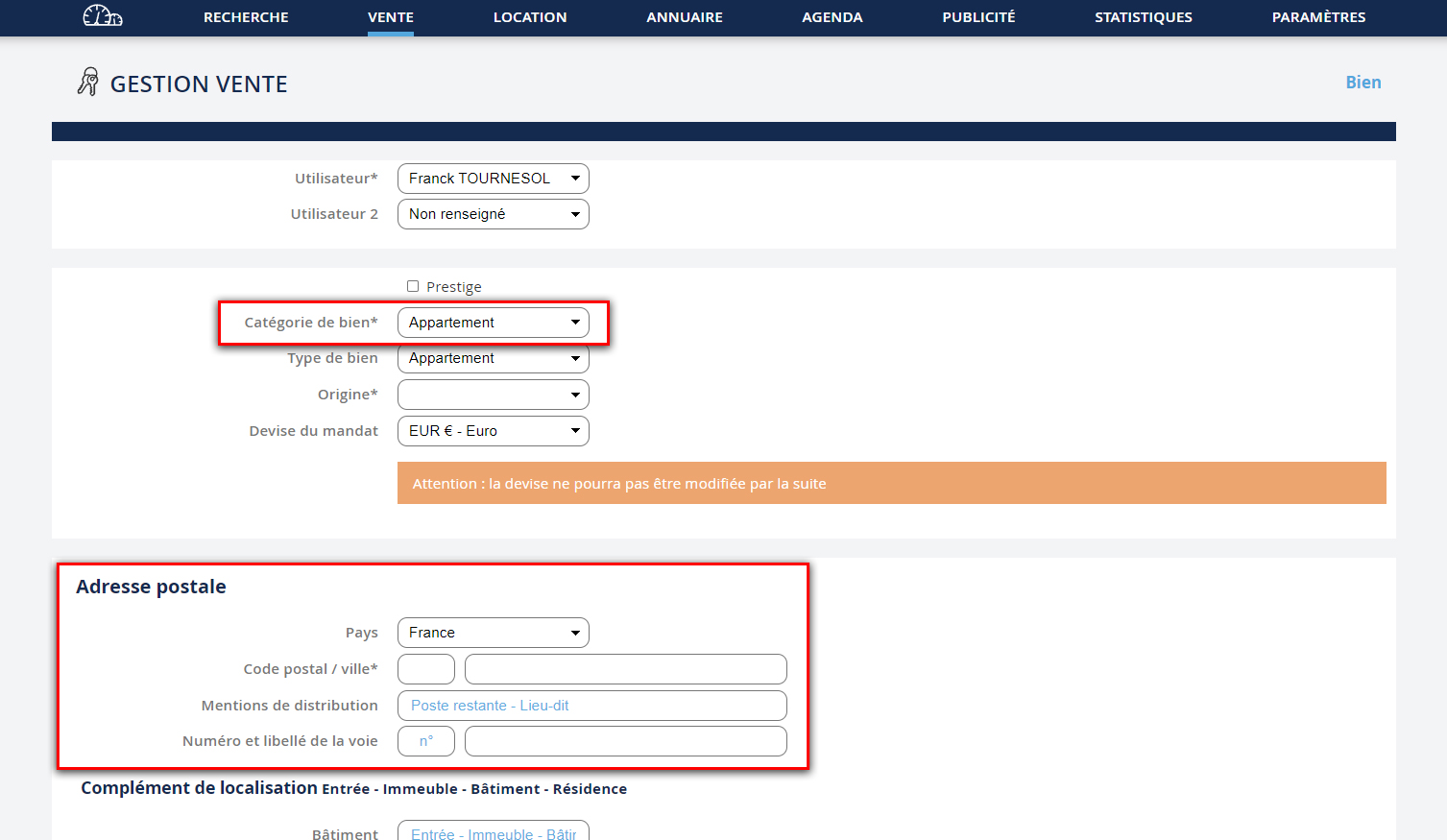 Le formulaire ci-contre s'ouvre Vous devez au minimum : Modifier votre recherche : 1. Choisir la catégorie du bien 2. Compléter les coordonnées postales du bien NB : n’oubliez pas de cliquer sur "Validez" (en bas de la page)