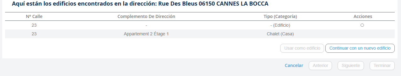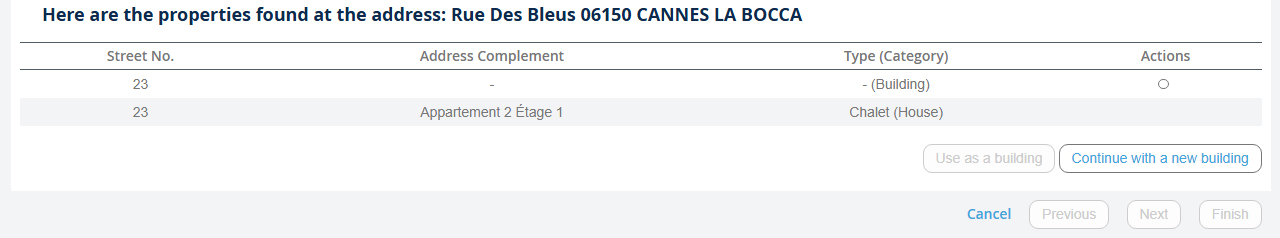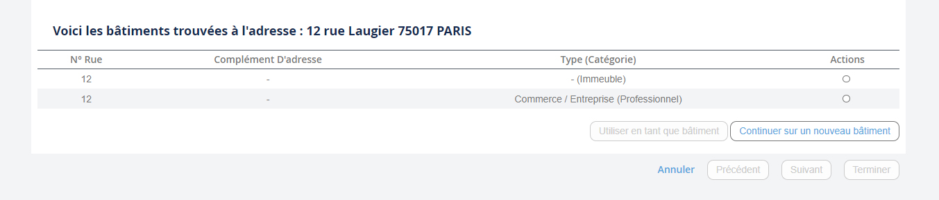 Antes de continuar con la entrada de este nuevo mandato, el software verifica si ya se ha registrado una propiedad en esta dirección. Para evitar la duplicación, esta funcionalidad le permite recuperar información sobre la construcción y la comunidad de propietarios.