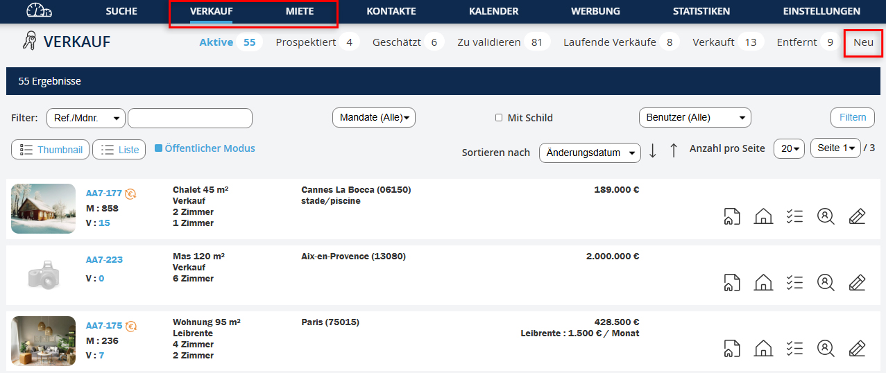 1. Im Menü auf "Verkauf" oder "Vermietung" klicken. 2. Im Untermenü auf "Neu" klicken.
