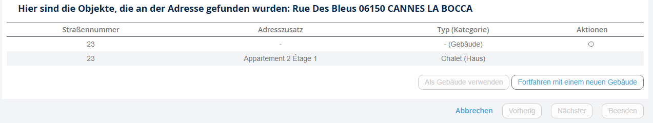 Bevor Sie mit der Eingabe dieses neuen Mandats fortfahren, überprüft die Software, ob eine Immobilie bereits unter dieser Adresse registriert wurde. Um eine doppelte Eingabe zu vermeiden, ermöglicht diese Funktion, Informationen über den Bau und das Gemeinschaftseigentum abzurufen.