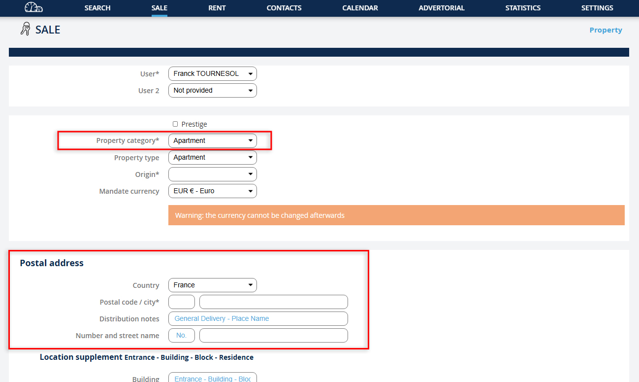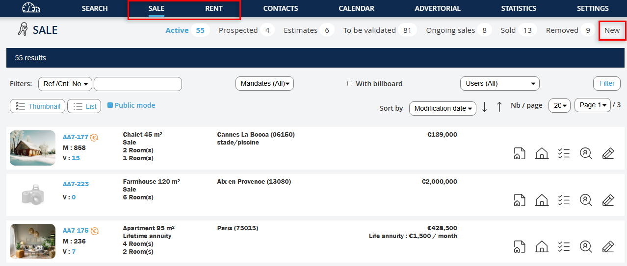 1. In the menu, click on "Sale" or "Rental". 2. In the submenu, click on "New".