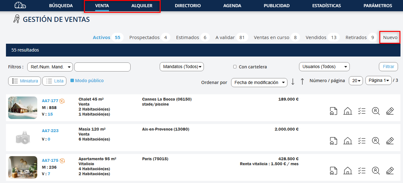 1. En el menú, haga clic en "Venta" o "Alquiler". 2. En el submenú, haga clic en "Nuevo".