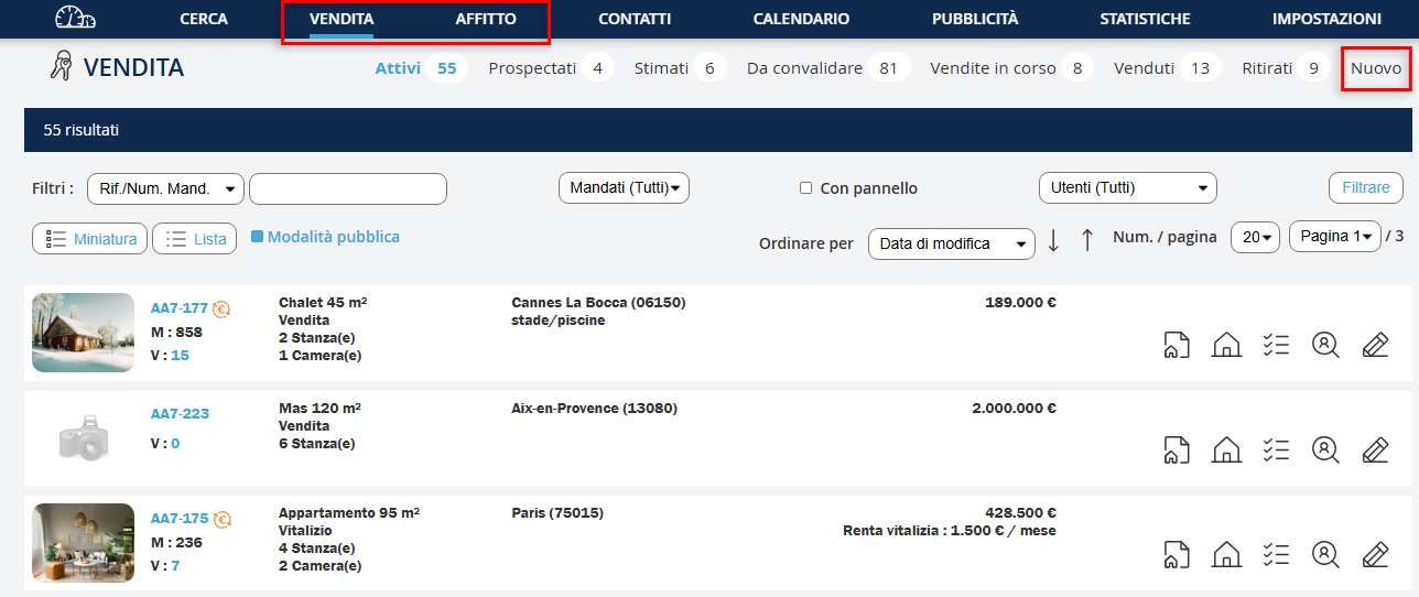 1. Nel menu, fai clic su "Vendita" o "Affitto". 2. Nel sottomenù, fai clic su "Nuovo".