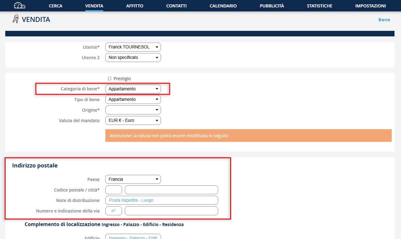 Indipendentemente dall'opzione scelta, ecco il modulo che devi compilare. (Immagine a destra). 1. I campi contrassegnati con * sono obbligatori NB: Non dimenticare di completare il modulo Aggiungi un proprietario 2. Per convalidare il tuo mandato nelle proprietà attive, devi fornire: - Il tipo di mandato - Il numero del mandato 3. Infine, per ottenere la scheda cliente più completa possibile, ti consigliamo di inserire quanti più criteri possibile. 4. Per salvare, non dimenticare di cliccare su "Fine".