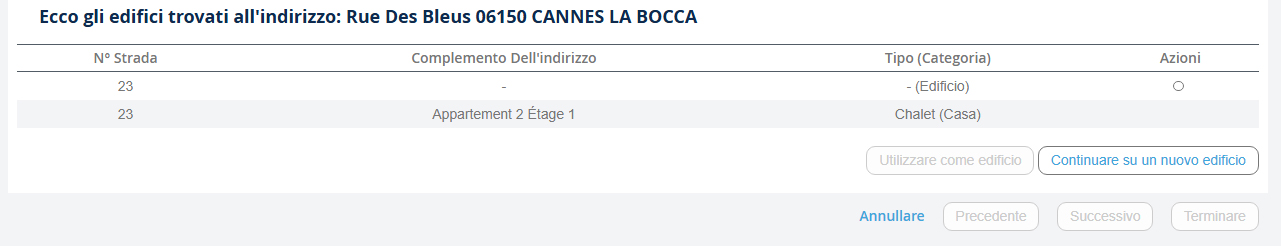 Prima di continuare con l'inserimento di questo nuovo mandato, il software verifica se una proprietà è già stata registrata a questo indirizzo. Per evitare duplicazioni, questa funzione consente di recuperare informazioni sulla costruzione e la proprietà comune.