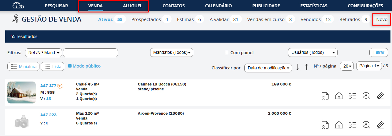 1. No menu, clique em "Venda" ou "Arrendamento". 2. No submenu, clique em "Novo".