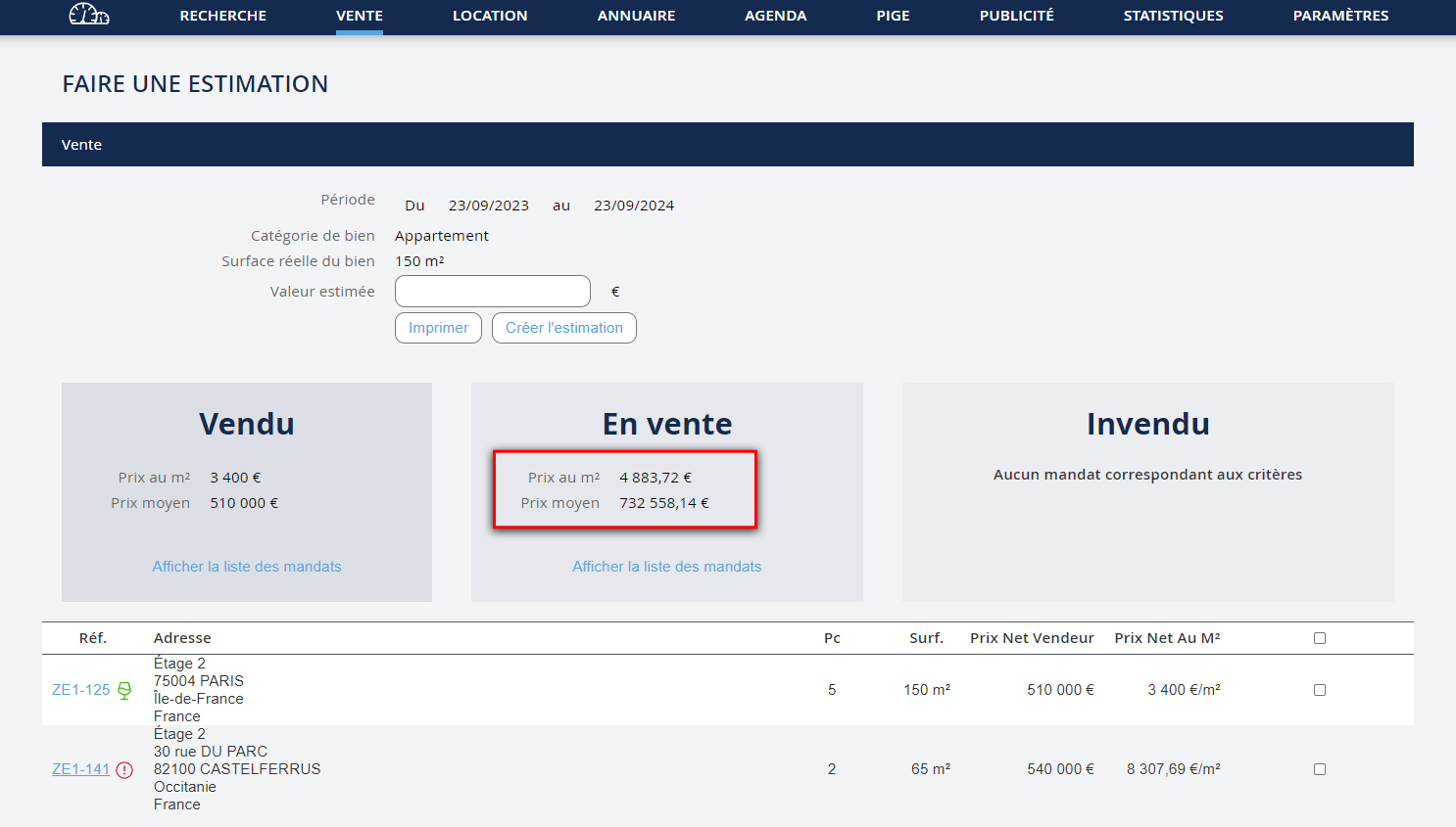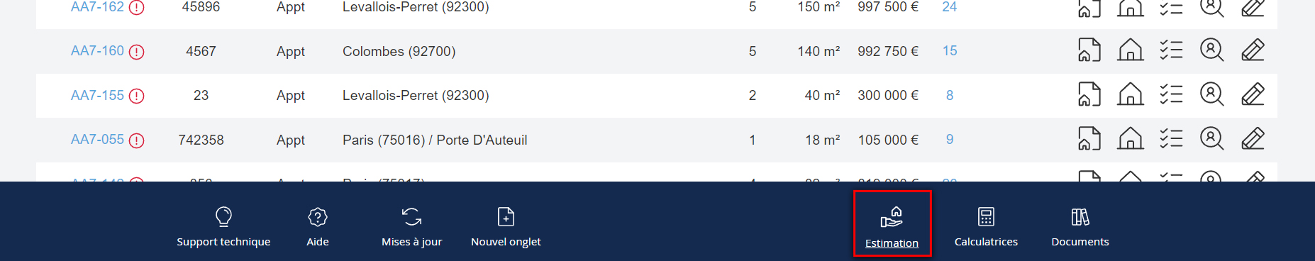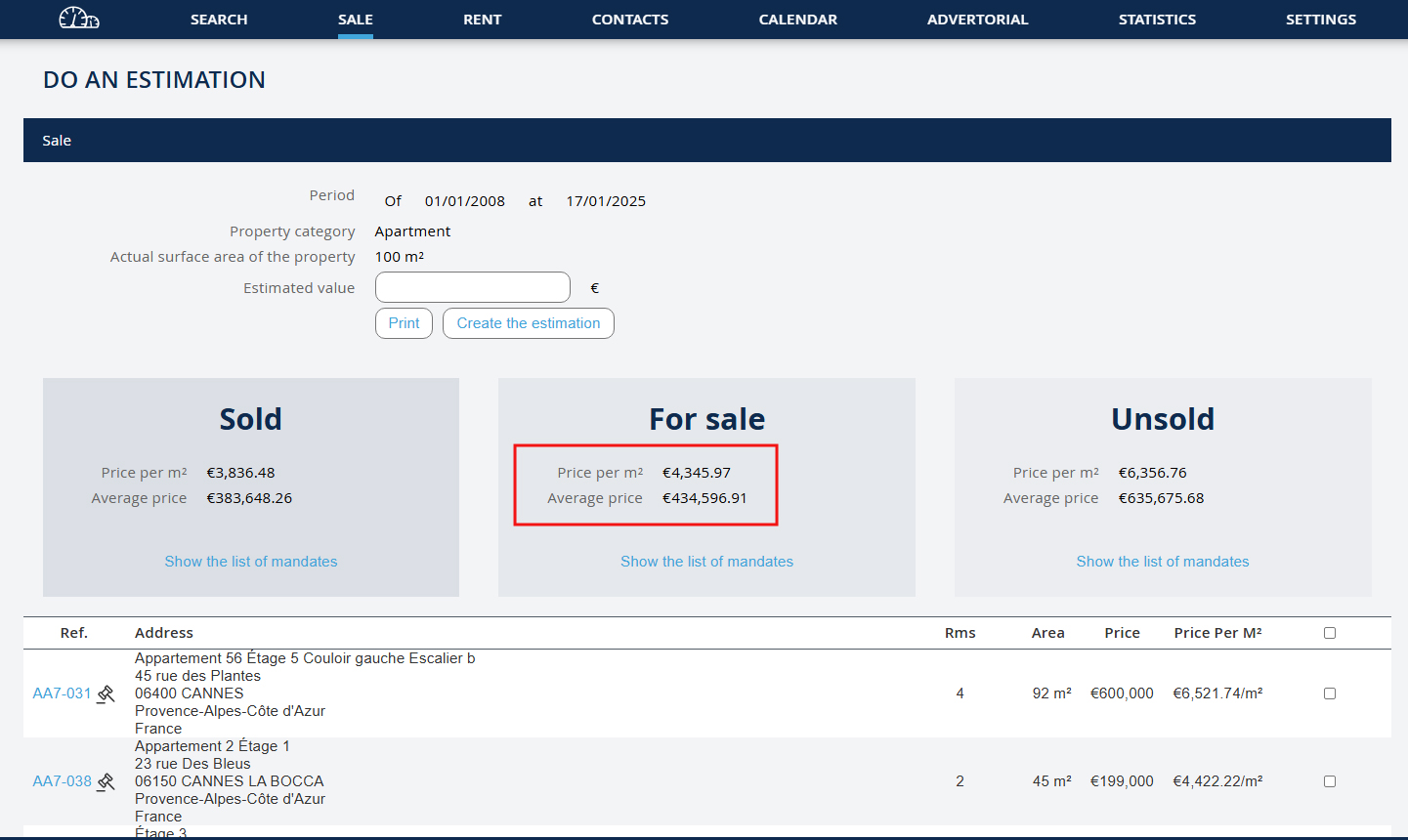 For each category, you will get the price per square meter and the average price. You can display the list of properties considered. NB: You can select properties to remove from the calculation. To remove a property: - Check the box to the left of the relevant row - And click on the "Refresh" button located under the list of properties.
