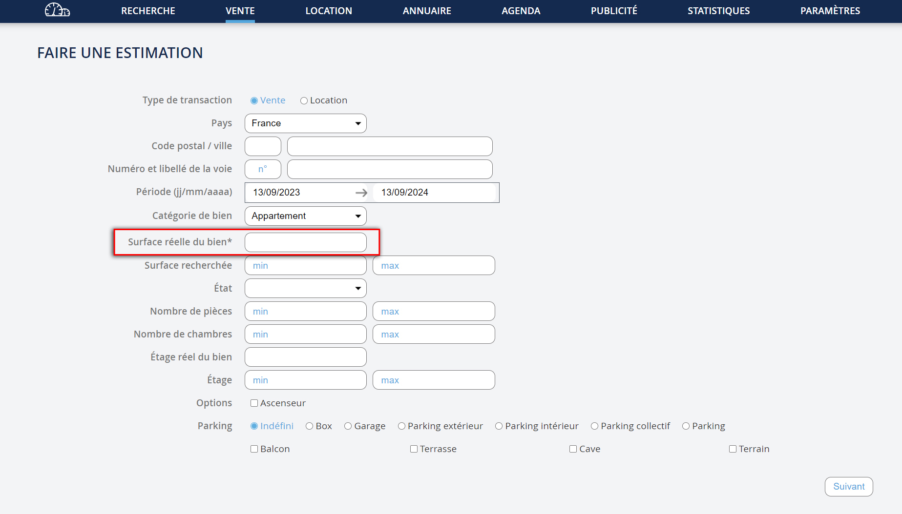 Puis, remplissez les différents champs proposés : - Si vous n’inscrivez pas la ville ou l’adresse du bien, alors le résultat de votre estimation se fera à partir de TOUS vos biens. - Le champ de la surface réelle du bien est le seul à être obligatoire. - Cliquez sur le bouton "Suivant" pour obtenir votre estimation.