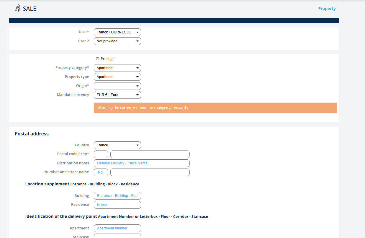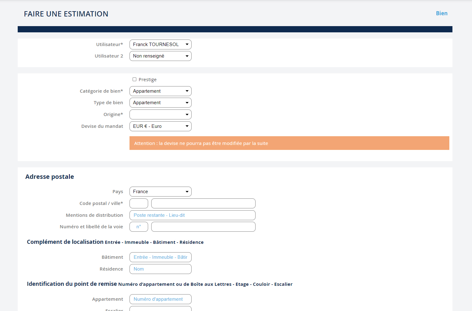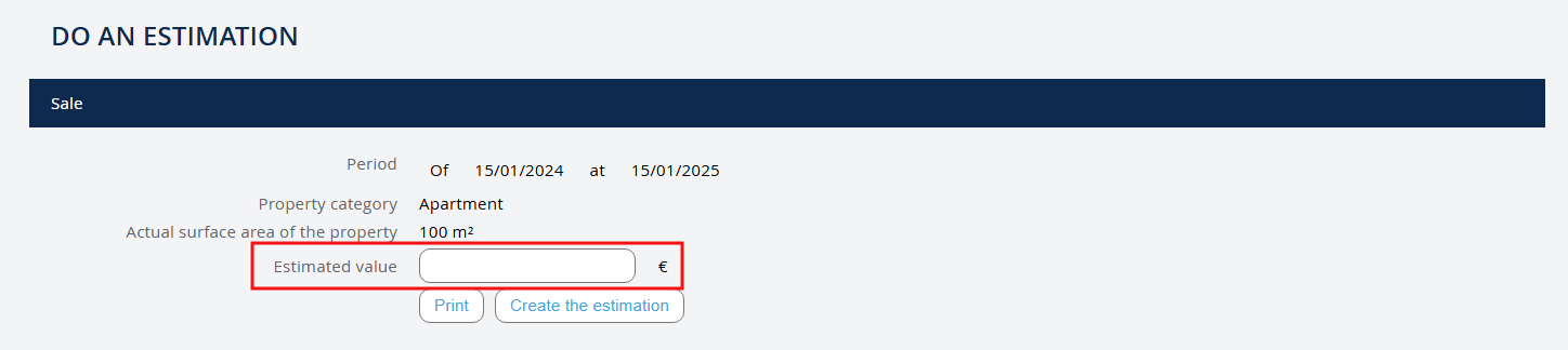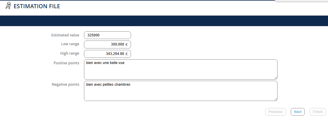 To finalize the recording, you must at least complete the following fields: - The address - The names of the owners - The number of rooms The more fields you complete, the more complete your estimate file will be. NB: You will find all your estimates in the submenu.