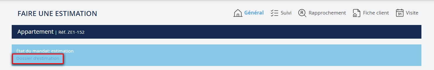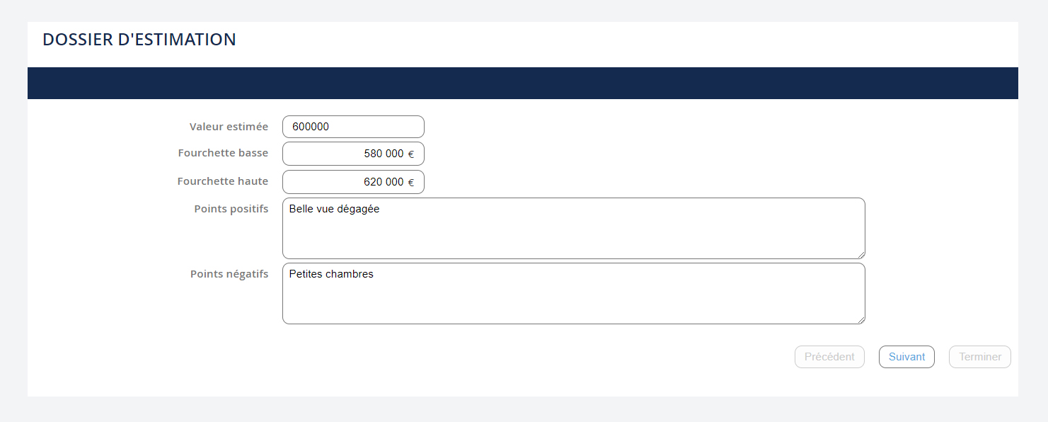 La création du dossier estimation se fait à partir du suivi du bien en cliquant sur "Dossier d'estimation". Dans ce nouveau formulaire vous pouvez renseigner les arguments sur lesquels vous avez fondé votre avis de valeur. Puis cliquez sur "Suivant" pour obtenir votre dossier d’estimation.