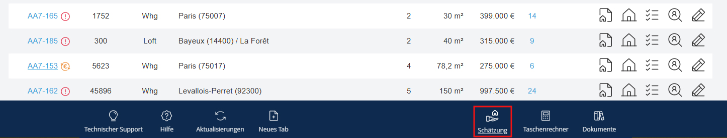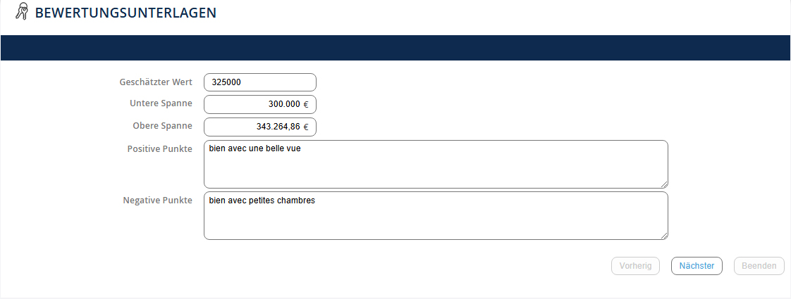 Um die Aufzeichnung abzuschließen, müssen Sie mindestens die folgenden Felder ausfüllen: - Die Adresse - Die Namen der Eigentümer - Die Anzahl der Zimmer Je mehr Felder Sie ausfüllen, desto vollständiger wird Ihr Schätzformular sein. Hinweis: Sie finden alle Ihre Schätzungen im Untermenü.