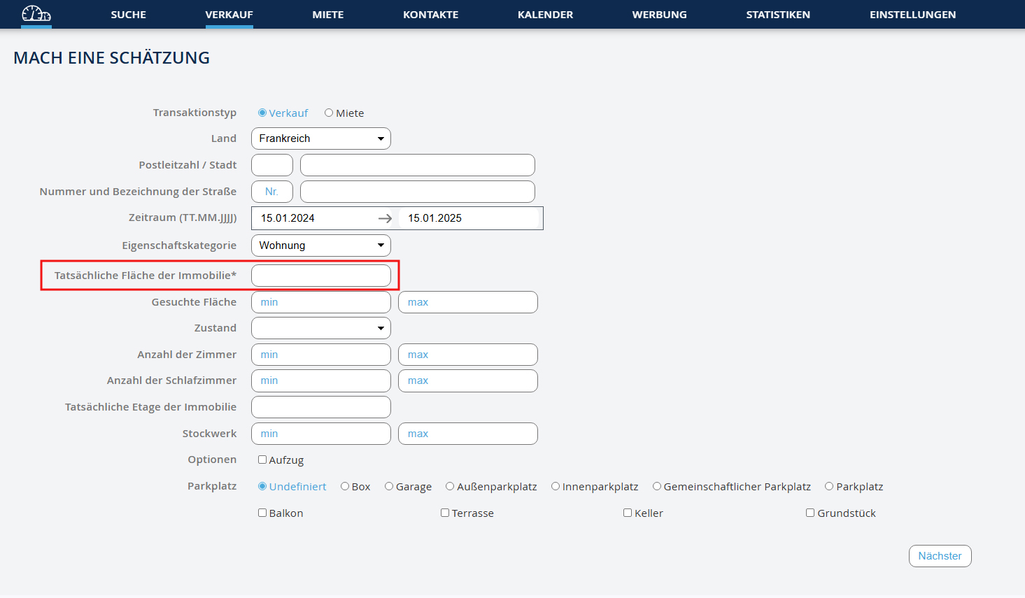 Füllen Sie dann die verschiedenen angebotenen Felder aus: - Wenn Sie die Stadt oder Adresse der Immobilie nicht eingeben, wird Ihre Schätzung anhand ALLER Ihrer Immobilien durchgeführt. - Das Feld für die tatsächliche Fläche der Immobilie ist das einzige, das obligatorisch ist. - Klicken Sie auf die Schaltfläche "Weiter", um Ihre Schätzung zu erhalten.