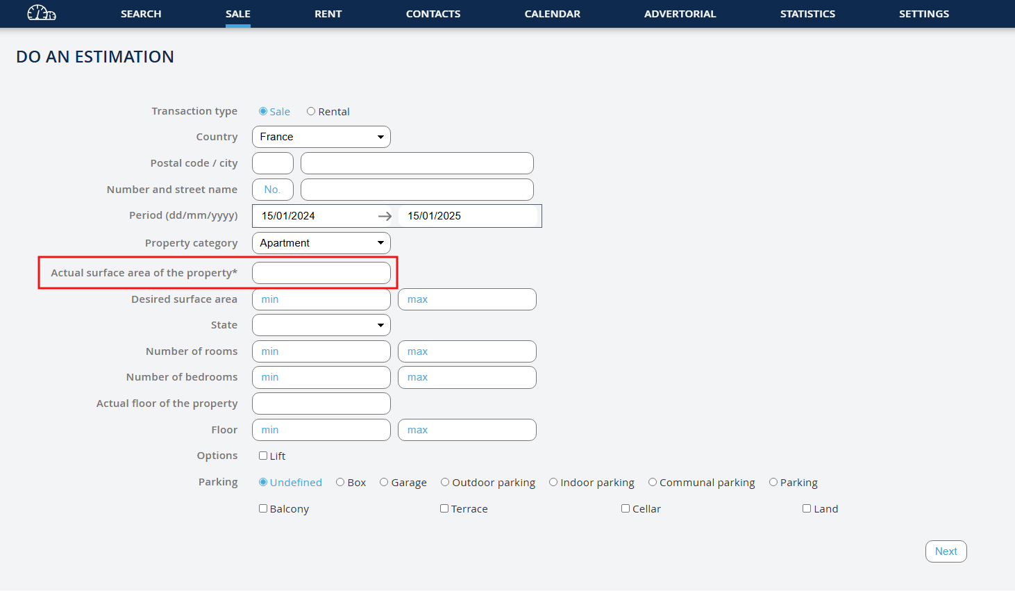 Then, fill in the various fields provided: - If you do not enter the city or address of the property, the result of your estimate will be made based on ALL your properties. - The field for the actual area of the property is the only one that is mandatory. - Click on the "Next" button to get your estimate.