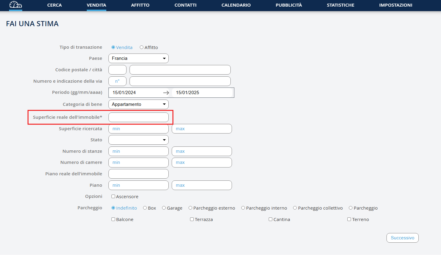 Quindi, compila i vari campi proposti: - Se non inserisci la città o l'indirizzo della proprietà, la tua stima sarà fatta a partire da TUTTE le tue proprietà. - Il campo per la superficie effettiva della proprietà è l'unico obbligatorio. - Fai clic sul pulsante "Avanti" per ottenere la tua stima.