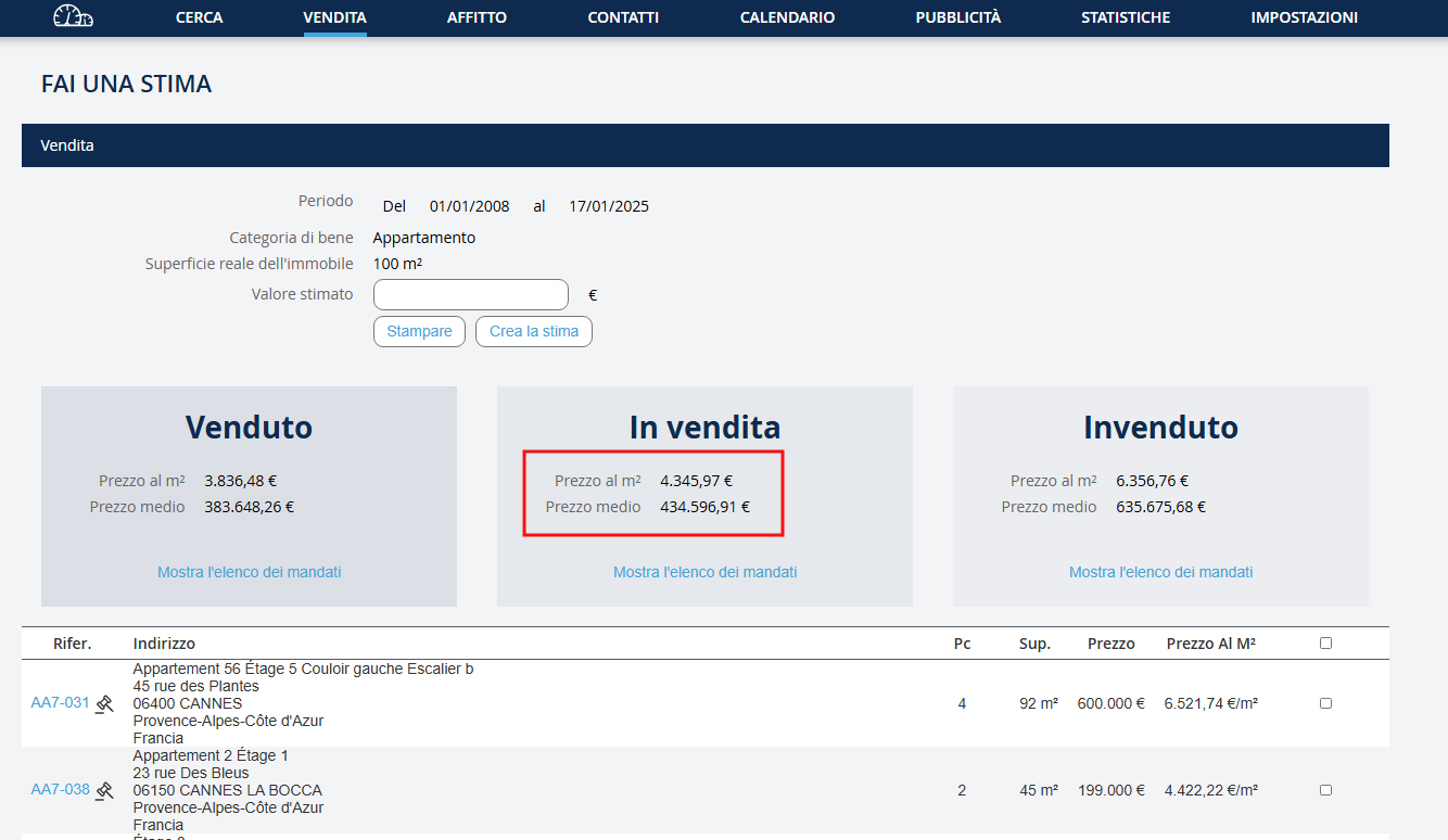 Per ogni categoria ottieni il prezzo al metro quadrato e il prezzo medio. Puoi visualizzare la lista delle proprietà prese in considerazione. Nota: puoi selezionare le proprietà da rimuovere dal calcolo. Per rimuovere una proprietà: - Seleziona la casella a sinistra della riga interessata - E clicca sul pulsante "Rinfrescare", che si trova sotto la lista delle proprietà.