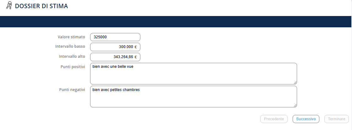 Per finalizzare la registrazione, è necessario almeno compilare i seguenti campi: - L'indirizzo - I nomi dei proprietari - Il numero delle stanze Più campi compili, più completo sarà il tuo modulo di stima. Nota: troverai tutte le tue stime nel sottomenu.