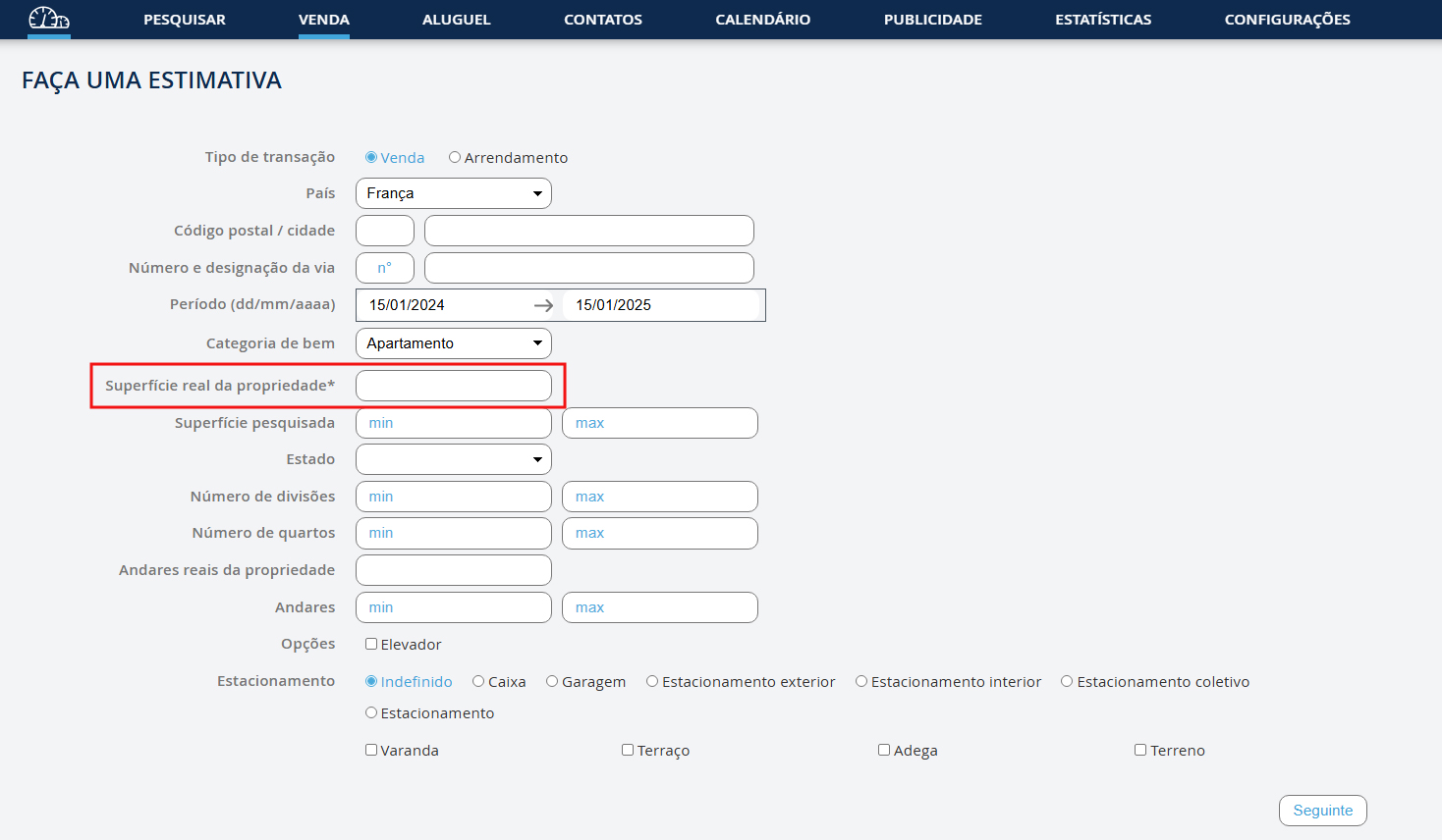 Depois, preencha os vários campos propostos: - Se não inserir a cidade ou o endereço da propriedade, a sua estimativa será feita com base em TODOS os seus bens. - O campo da área real da propriedade é o único obrigatório. - Clique no botão "Seguinte" para obter a sua estimativa.