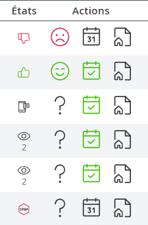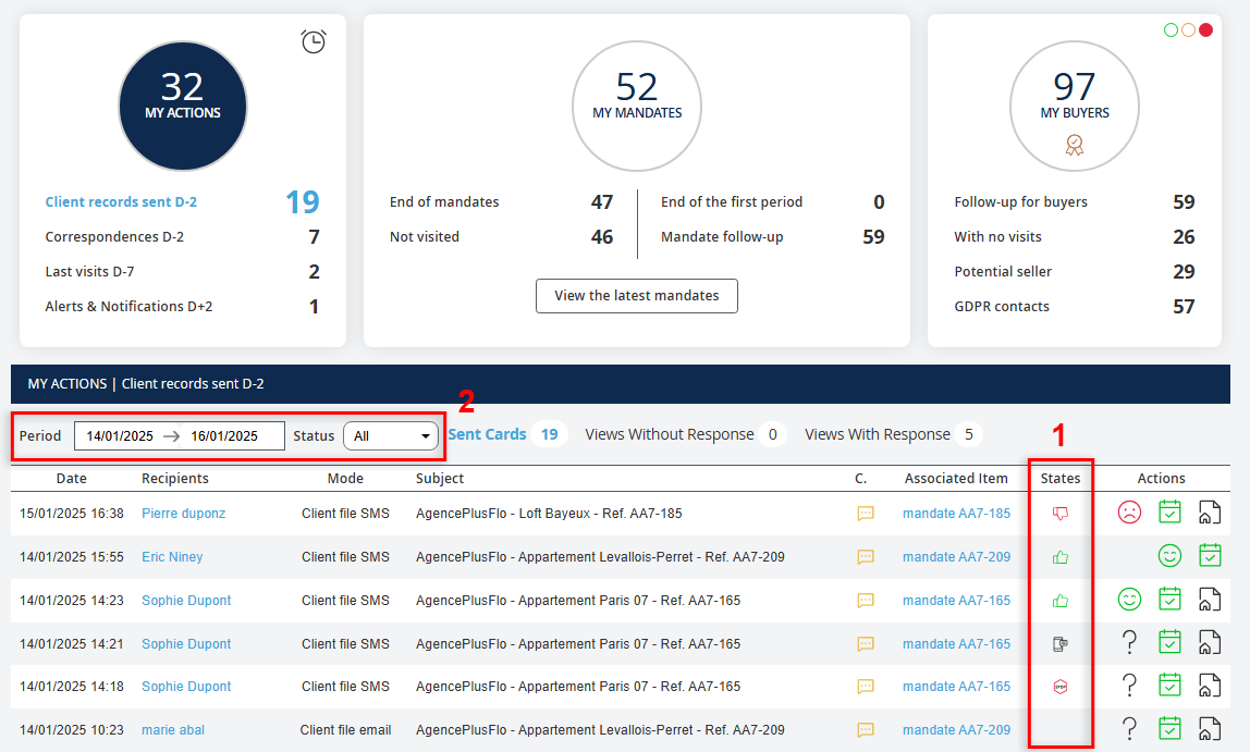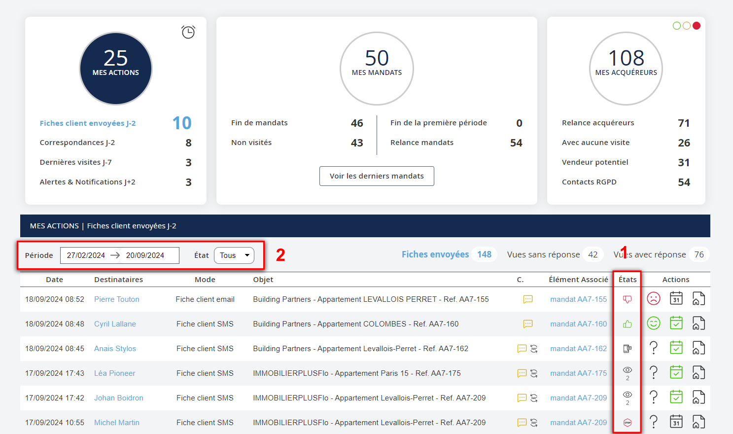 From your dashboard, you will find the "States" column (1). This allows you to see at a glance the responses from your clients following the sending of a sheet, so you can track their responses in real-time. N.B: This feature is only available for client sheets named "property sheet n°..." from n°1 to n°6. By clicking in the "My Actions" section, under Client Sheets Sent J-2, a list of client sheets sent by the negotiator from the last 2 days appears (you can modify the period in the Period (2) field if you wish to broaden your search).