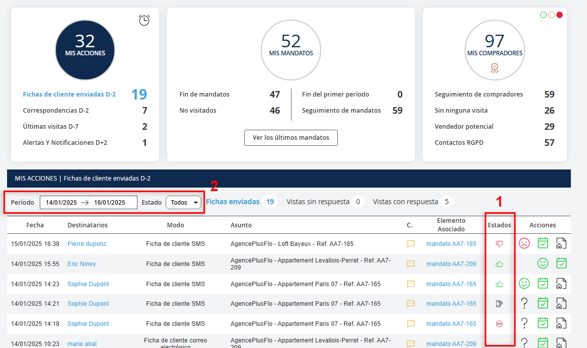 Desde su tablero, encontrará la columna "Estados" (1). Le permite ver de un vistazo las respuestas de sus clientes después del envío de una ficha, por lo que podrá seguir sus respuestas en tiempo real. Nota: Esta funcionalidad está disponible únicamente para las fichas de cliente denominadas "ficha de vivienda n°..." desde el n°1 hasta el n°6. Al hacer clic en la sección "Mis Acciones", en Fichas de Cliente Enviadas J-2, aparecerá una lista de las fichas enviadas por el negociador en los últimos 2 días (puede modificar el período en el campo Período (2) si desea ampliar la búsqueda).