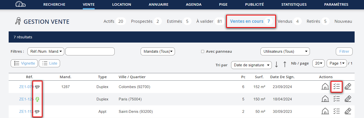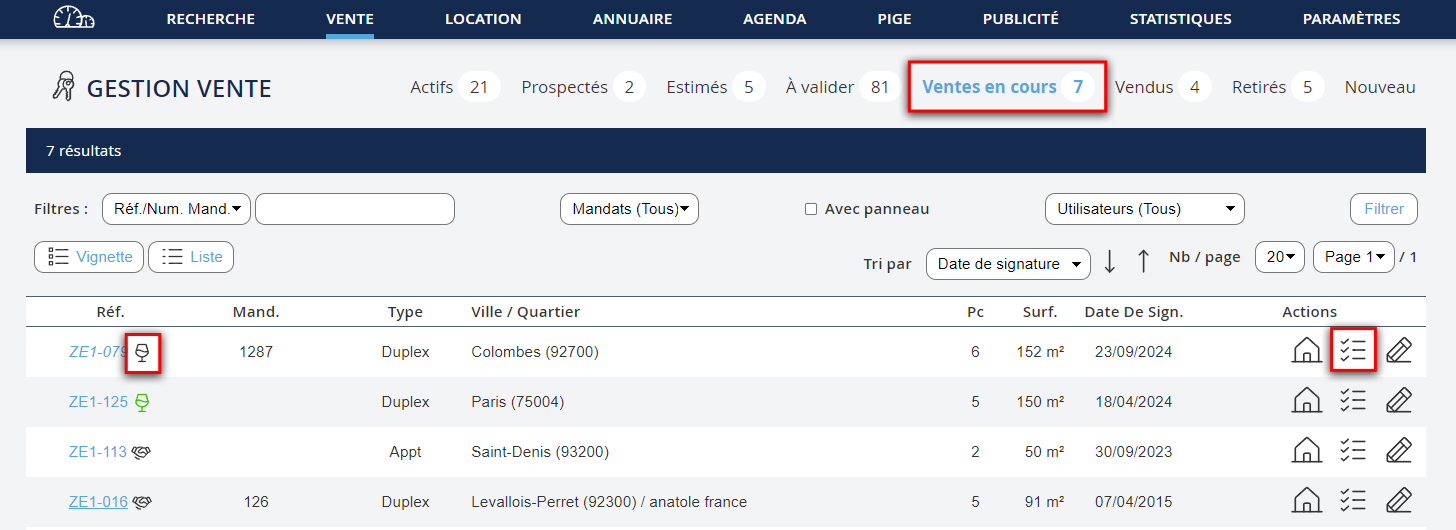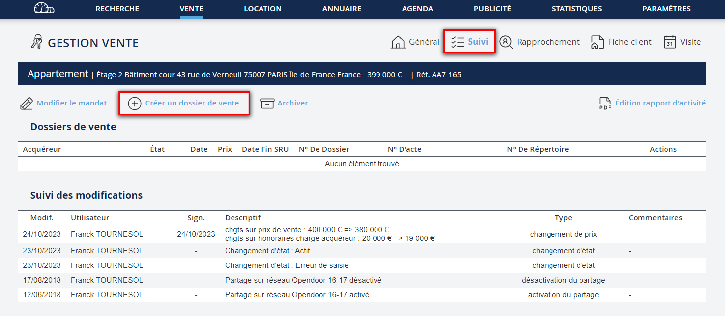 Pour créer un dossier de vente, allez dans le menu "Vente". Puis : 1. Allez dans le Suivi de la fiche du bien.