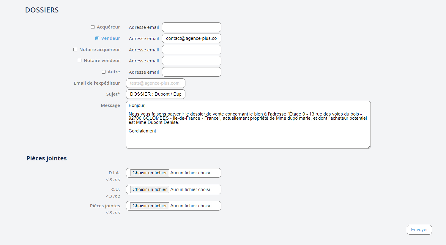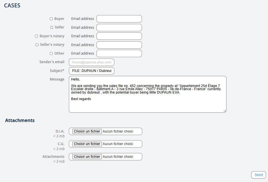 Se gli indirizzi email dei contatti sono già registrati in Agence Plus, i campi Indirizzo email verranno automaticamente compilati. Il soggetto e il messaggio sono precompilati per impostazione predefinita, ma puoi modificarli come preferisci. È anche possibile allegare documenti come: "copia dei documenti di identità", "certificato di matrimonio" o altri… Non dimenticare di fare clic su "Invia".