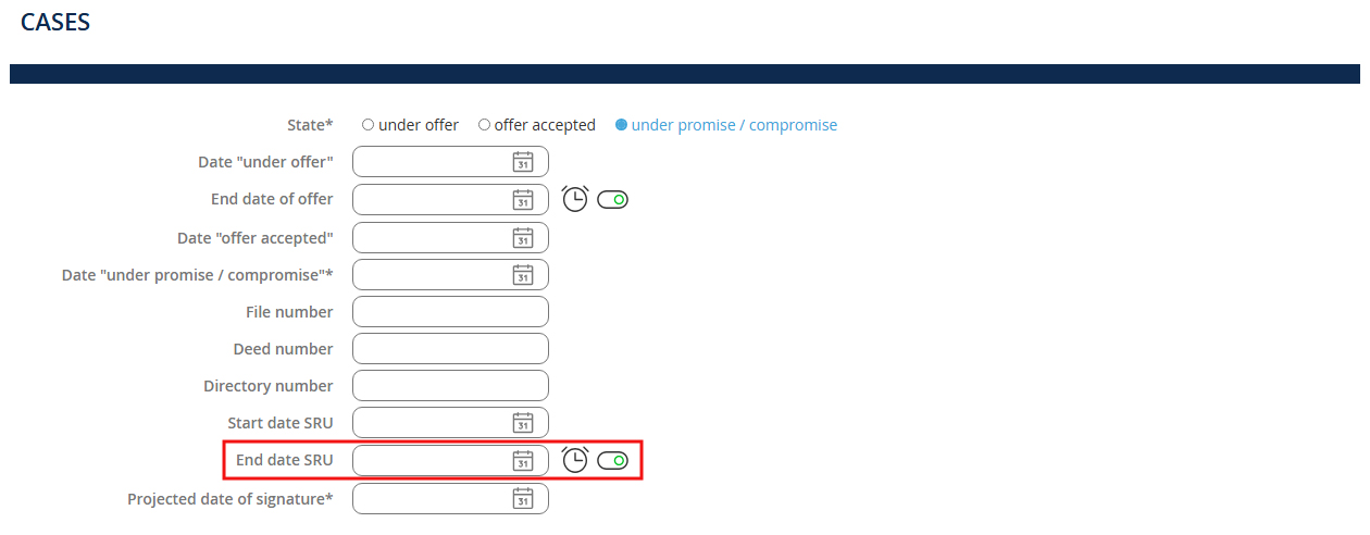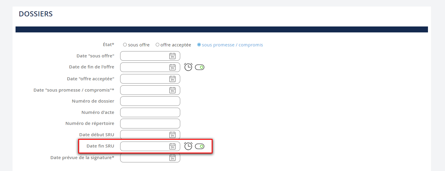 NB: To help you track your files, we advise you to keep the alert boxes checked when you record dates of SRU, loan approval, etc., to create reminders in your dashboard.