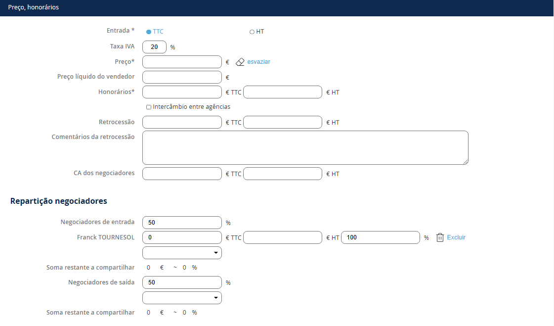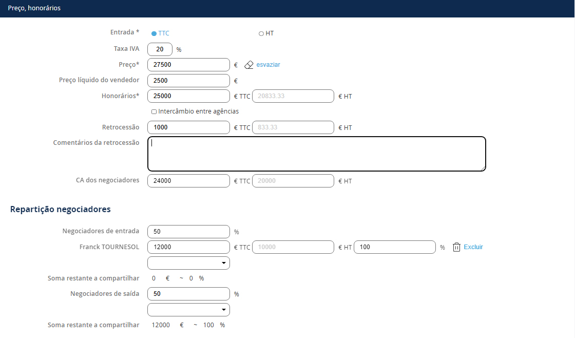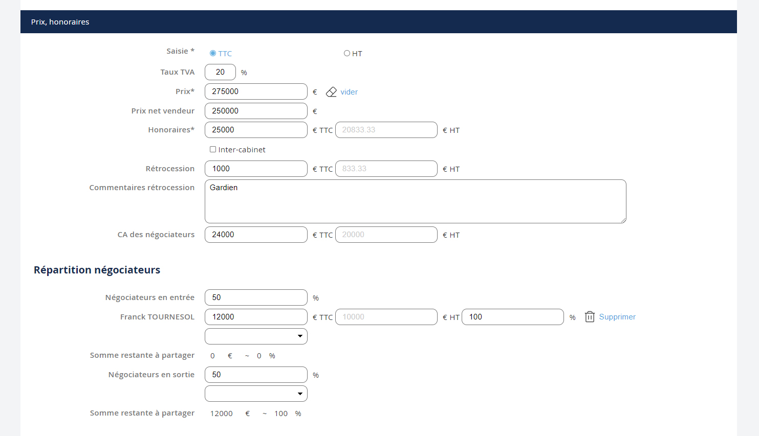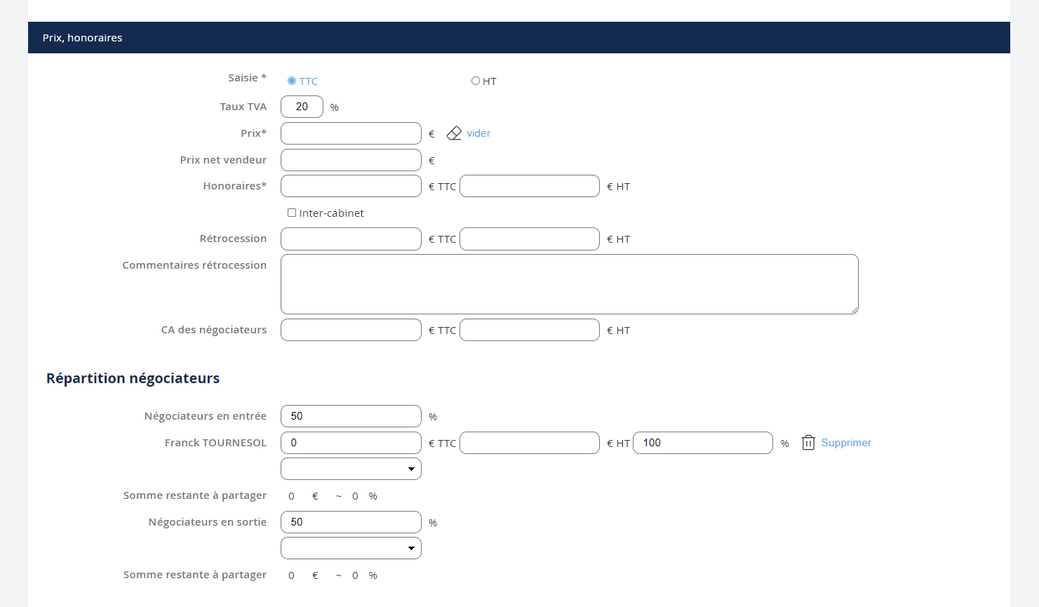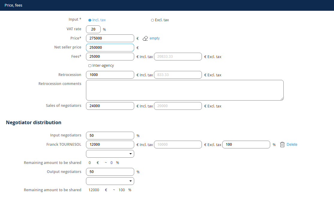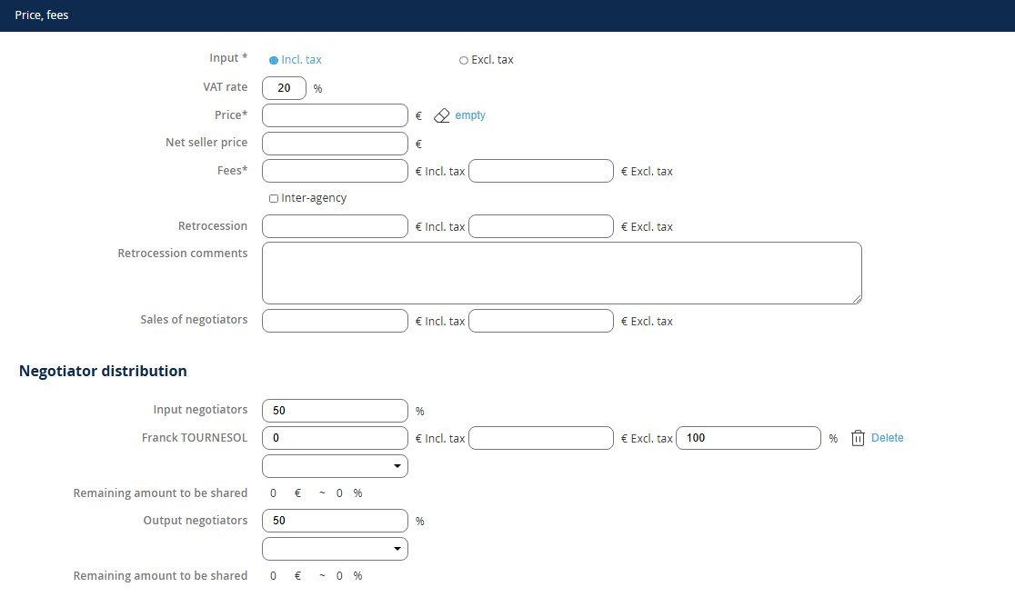 After recording the sale price, your fees and the retrocession (if applicable), to register the negotiator's distribution, you must: 1. Define the percentages for entry and exit 2. Add the relevant negotiator(s) NB: To add an additional negotiator for entry or exit, select the negotiator's name from the list and click the + 3. Finally, if you have multiple negotiators for entry or exit, define the distribution for each.