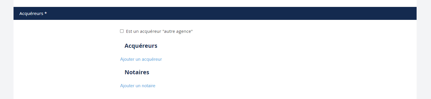 NB : Dans le cas d’une offre, si vous n’avez pas les coordonnées de l’acquéreur présenté par une autre agence, dans ce cas pour valider le formulaire cochez la case : Est un acquéreur 'autre agence'