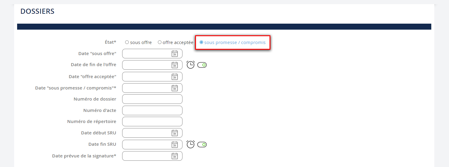 Vous devez au minimum : 1. Sélectionner l'état de votre dossier : Sous offre, Offre acceptée ou Sous promesse / compromis 2. Puis, quel que soit l'état choisi, compléter les champs qui apparaissent.NB : pensez à vous créer des alertes