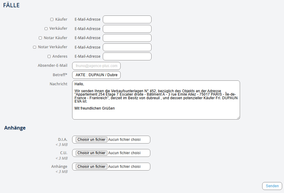 Wenn die E-Mail-Adressen der Kontakte bereits in Agence Plus gespeichert sind, werden die Felder E-Mail-Adresse automatisch ausgefüllt. Der Betreff und die Nachricht sind standardmäßig ausgefüllt, können jedoch nach Bedarf geändert werden. Es ist auch möglich, Anhänge wie "Kopie der Ausweisdokumente", "Heiratsurkunde" oder andere anzufügen… Vergessen Sie nicht, auf "Absenden" zu klicken.