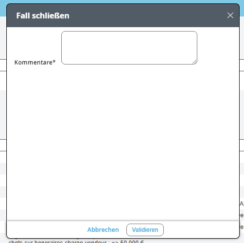 Das Fenster nebenan öffnet sich, um es Ihnen zu ermöglichen, einen Kommentar auszufüllen, wie z.B.: - Meinungsänderung des Käufers, - Negative Zweitbesichtigung, - Kredit von der Bank abgelehnt, - usw. Klicken Sie auf "Bestätigen" für den Abschluss Ihrer Akte.