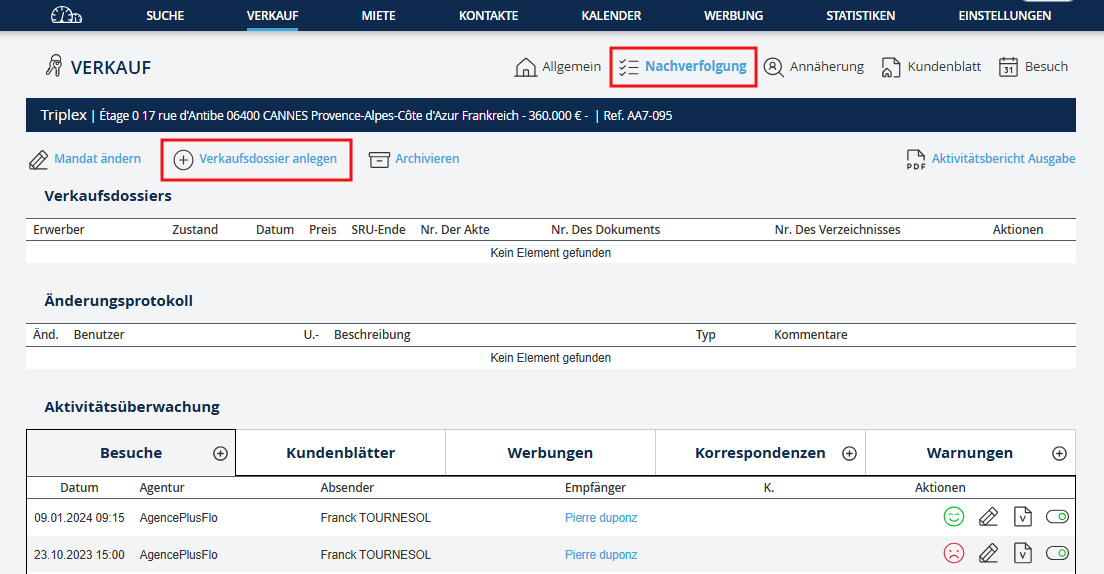Erstellen Sie eine Verkaufsakte, gehen Sie zum Menü "Verkauf". Dann: 1. Gehen Sie zum Verlauf des Objektblatts.
