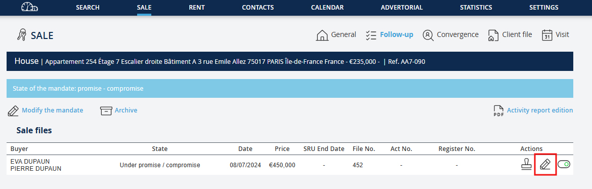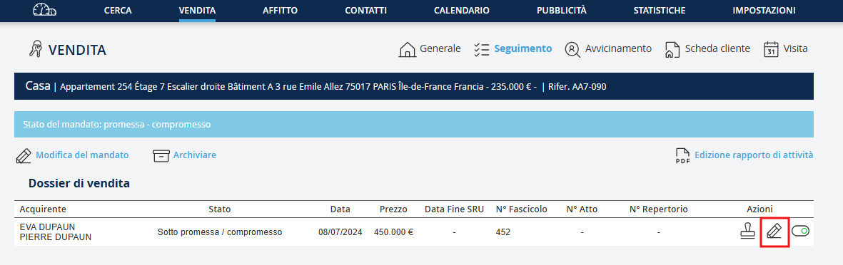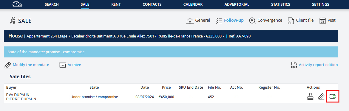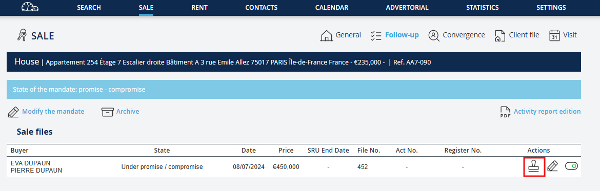 La registrazione di un'offerta d'acquisto, una promessa o un compromesso di vendita comporta la creazione di un file di vendita.