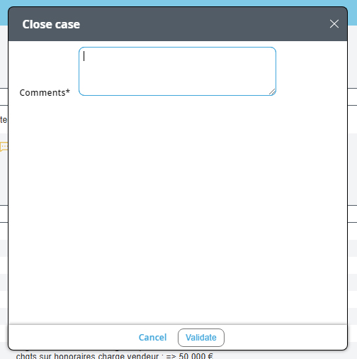 The window next to this opens to allow you to fill in a comment such as: - Change of mind of the buyer, - Negative second visit, - Loan refused by the bank, - etc. All you need to do is "Confirm" the closure of your file.