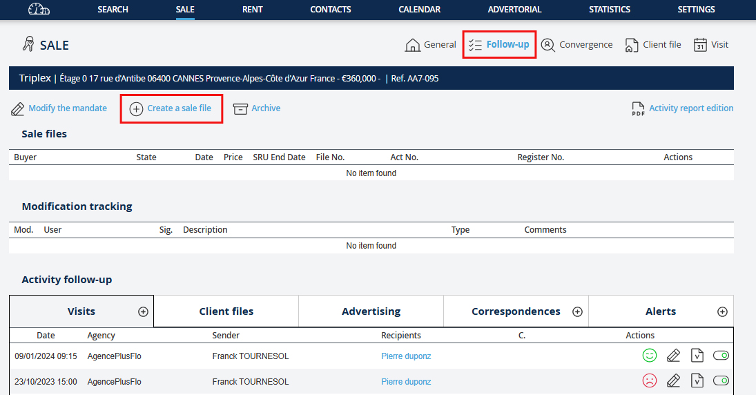To create a sales file, go to the menu "Sales". Then: 1. Go to the Tracking of the property sheet.