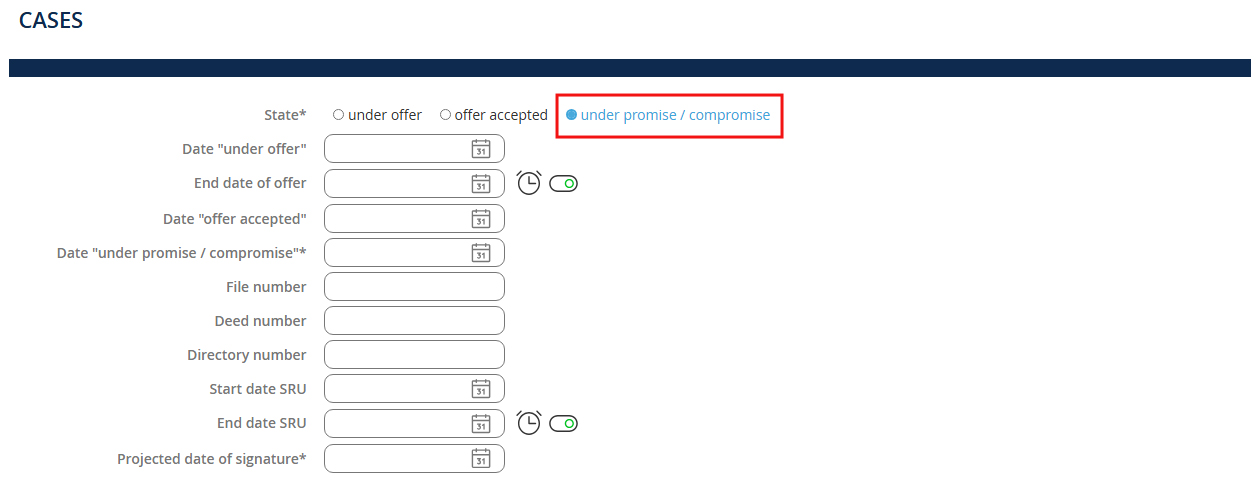 You must at least: 1. Select the status of your file: Under offer, Offer accepted, or Under promise / agreement
