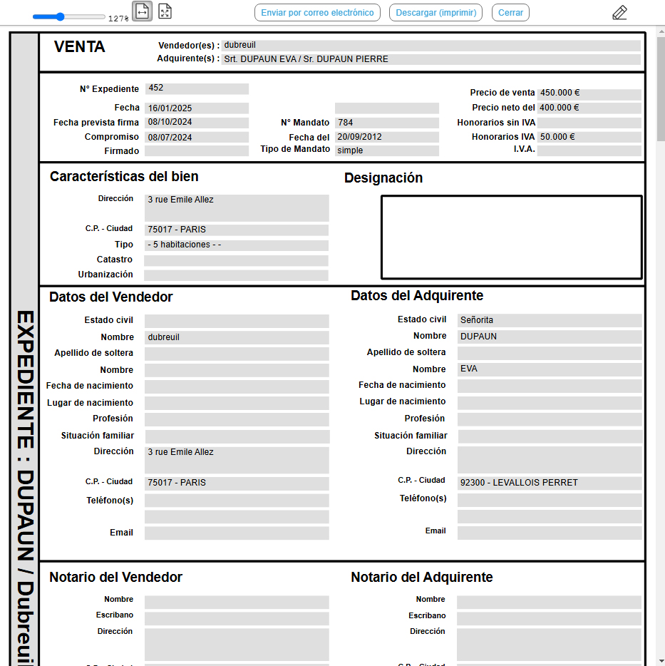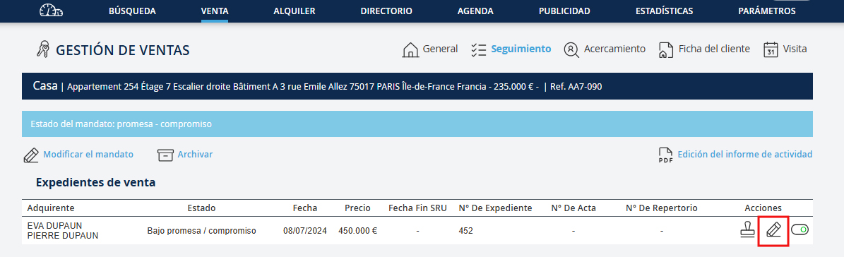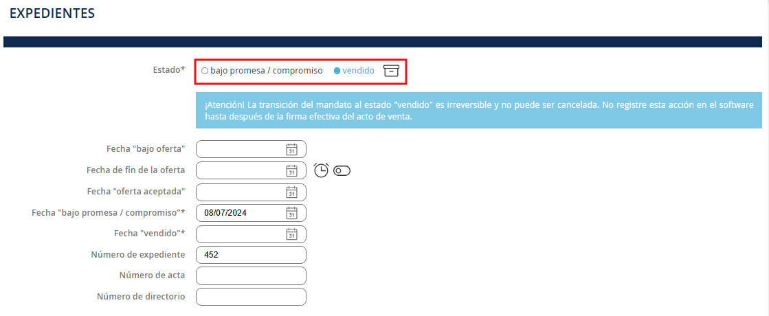 El registro de una oferta de compra, una promesa o un compromiso de venta implica la creación de un expediente de venta.