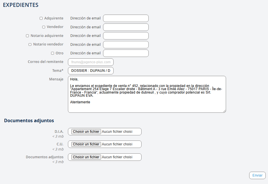 Si las direcciones de correo electrónico de los contactos ya están registradas en Agence Plus, los campos de Dirección de correo electrónico se llenarán automáticamente. El asunto y el mensaje se completan por defecto, pero puede modificarlos según sea necesario. También es posible adjuntar documentos como: "copia de los documentos de identidad", "certificado de matrimonio" o demás… No olvide hacer clic en "Enviar".