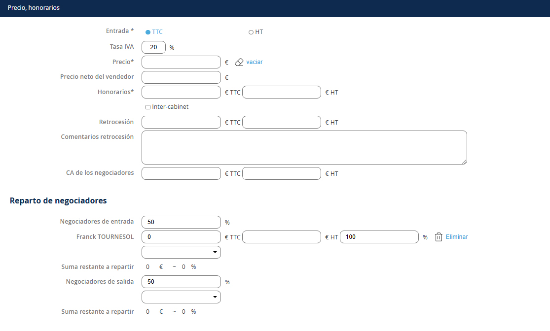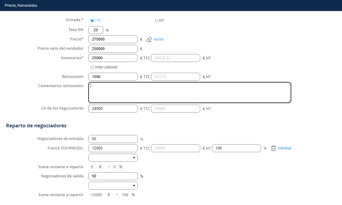 Después de registrar el precio de la venta, sus honorarios y la retrocesión (si es necesario), para registrar la distribución de los negociadores, debe: 1. Definir los porcentajes de entrada y salida 2. Añadir el o los negociador(es) correspondientes NB: Para agregar un negociador adicional en entrada o salida, seleccione el nombre del negociador en la lista y haga clic en + 3. Finalmente, si tiene varios negociadores en entrada o salida, defina la distribución de cada uno.