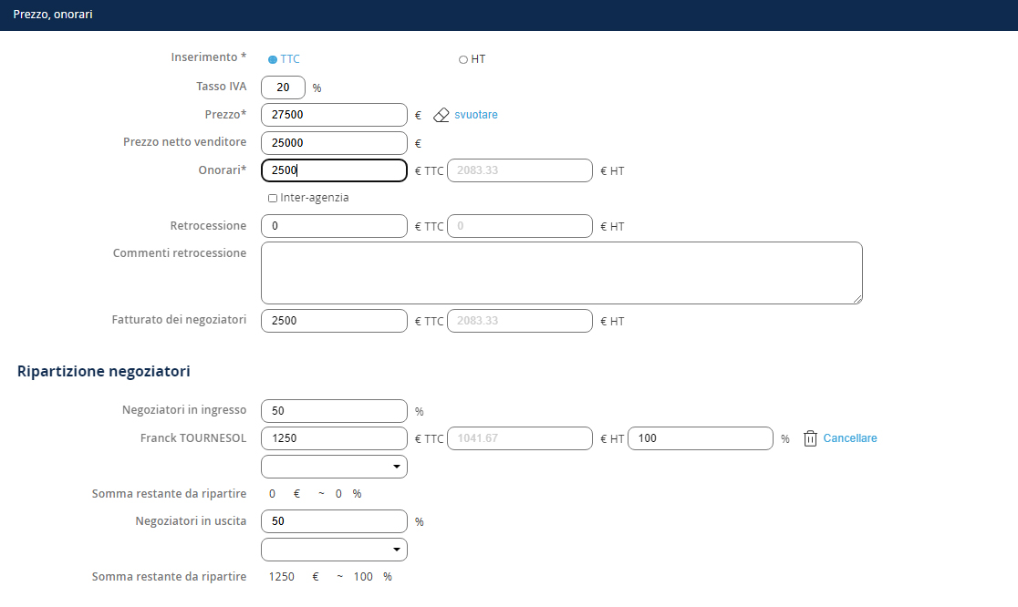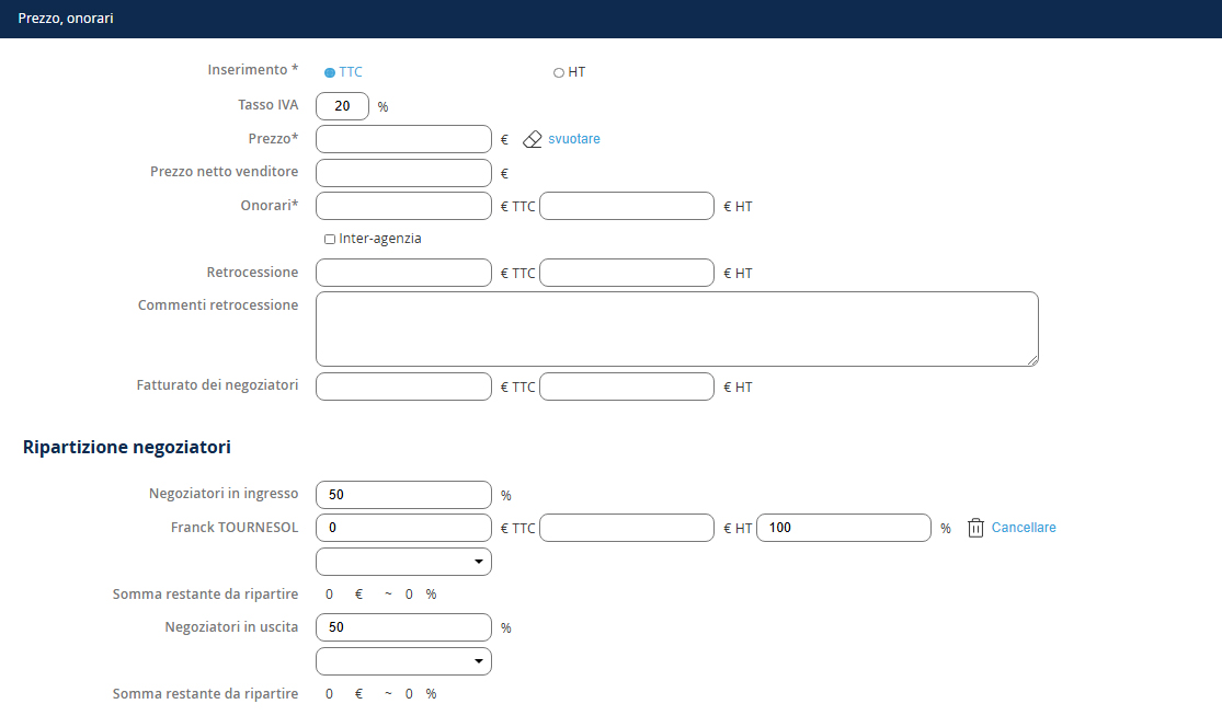 Dopo aver registrato il prezzo di vendita, le tue commissioni e la retrocessione (se necessarie), per registrare la distribuzione dei negoziatori, devi: 1. Definire le percentuali per ingresso e uscita 2. Aggiungere il o i negoziatori pertinenti NB: Per aggiungere un negoziatore aggiuntivo in ingresso o uscita, seleziona il nome del negoziatore dalla lista e clicca su + 3. Infine, se hai più negoziatori in ingresso o uscita, definisci la distribuzione per ciascuno.