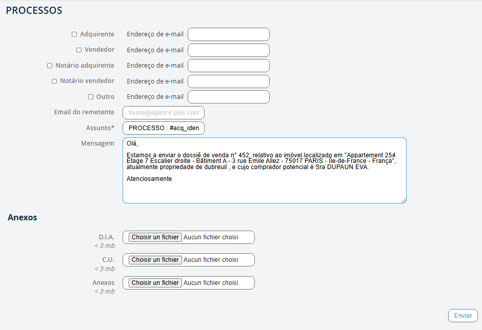 Se os endereços de e-mail dos contactos já estão registados no Agence Plus, os campos Endereço de e-mail serão automaticamente preenchidos. O assunto e a mensagem são preenchidos por defeito, mas pode alterá-los conforme necessário. Também é possível anexar documentos como: "cópia dos documentos de identidade", "certificado de casamento" ou outros… Não se esqueça de clicar em "Enviar".