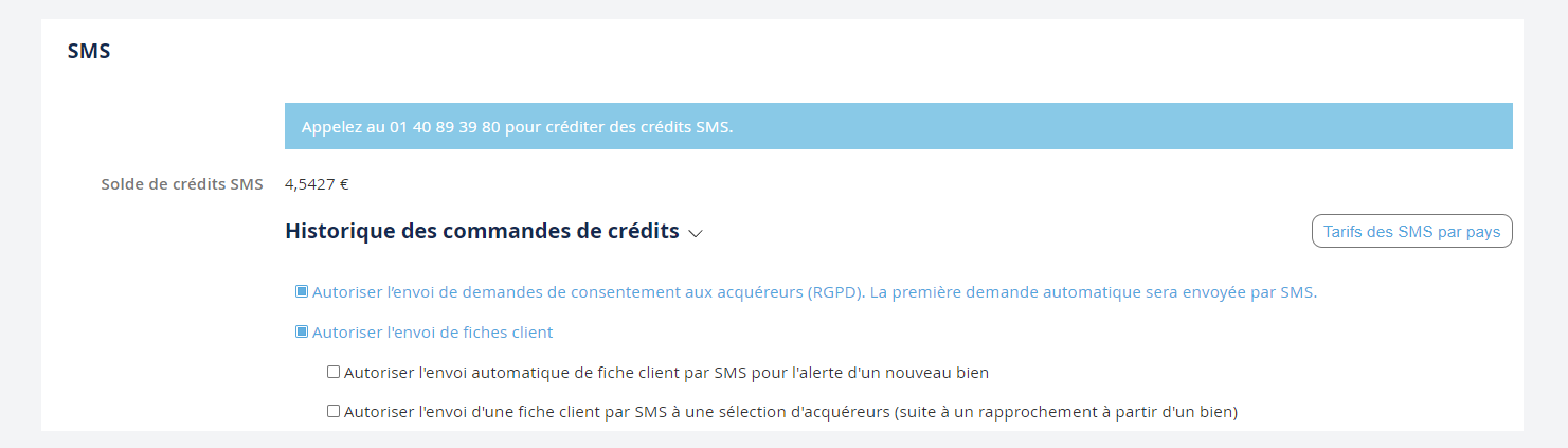 Tous les négociateurs avec des droits administrateurs ont par défaut l’option SMS activée et d’une façon illimitée (jusqu’à ce que le crédit agence soit soldé).