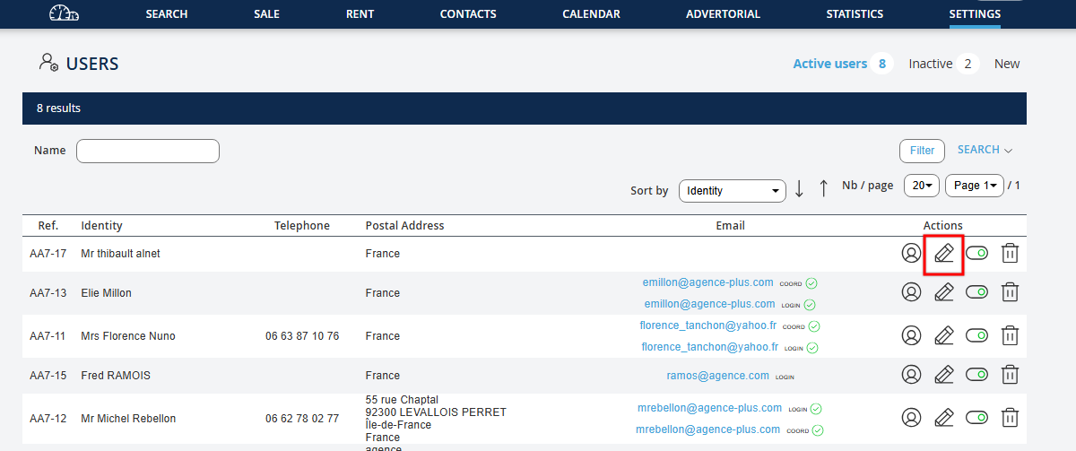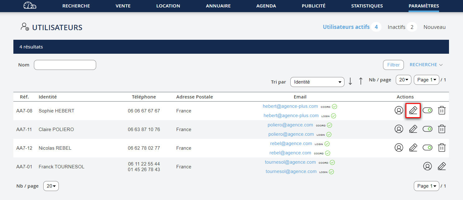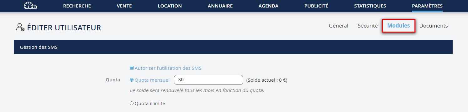 Dans Paramètres -> Utilisateurs (choisissez l’utilisateur sur lequel vous voulez autoriser l’emploi des SMS.) Pour la création d’un nouvel utilisateur, vous pouvez vous référez à la rubrique Paramétrages) -> cliquer sur le stylo à droite -> Modules -> Puis rubrique Gestion des SMS.