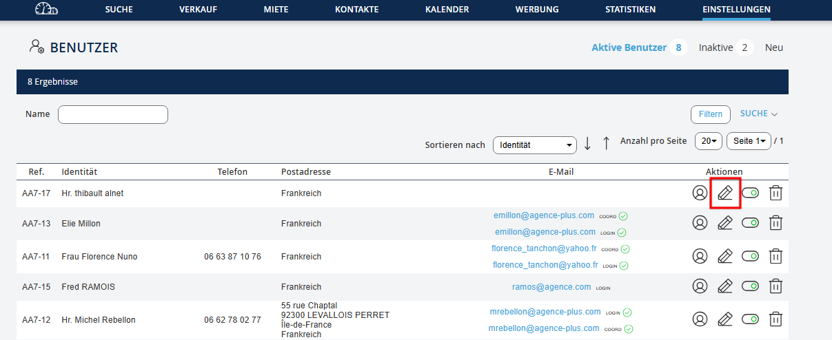 In Einstellungen -> Benutzer (Wählen Sie den Benutzer aus, für den Sie die Verwendung von SMS zulassen möchten.) Für die Erstellung eines neuen Benutzers können Sie sich auf den Abschnitt „Einstellungen“ beziehen) -> klicken Sie auf den Stift rechts -> Module -> Dann den Abschnitt SMS-Verwaltung auswählen.