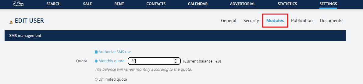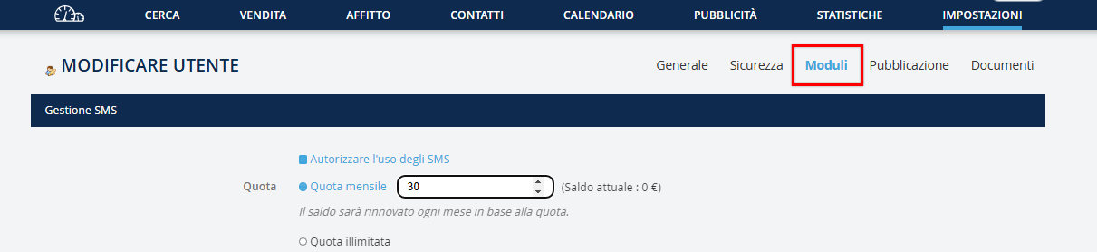 Per abilitare l'invio di SMS per questo negoziatore, selezionare la casella « Autorizza l'uso degli SMS ». NB: l'autorizzazione per gli SMS non è configurata di default, quindi è necessario abilitarla selezionando la casella « Autorizza l'uso degli SMS ». Puoi concedere una quota mensile, per farlo seleziona la casella « Quota mensile » per determinare il limite di credito SMS assegnato al negoziatore su un periodo di un mese. Questo viene fatto per evitare l'abuso di SMS. Ad esempio: una quota mensile di 30€ consente di inviare SMS fino a esaurimento del credito. Se il saldo si esaurisce prima della fine del mese, il negoziatore non potrà più inviare SMS. Ogni 1° del mese la quota viene ripristinata.