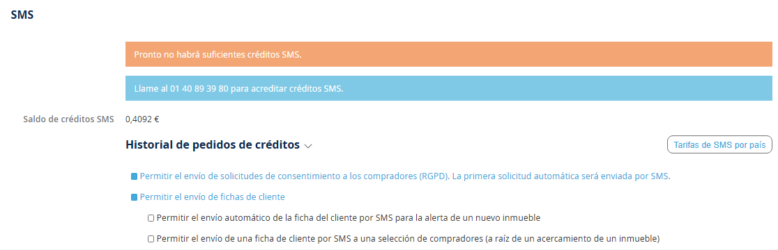 Todos los negociadores con derechos de administrador tienen la opción SMS activada por defecto e ilimitada (hasta que el crédito de la agencia se agote).