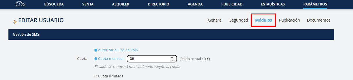 Para activar el envío de SMS para este negociador, marque la casilla « Autorizar el uso de SMS ». NB: la autorización de SMS no está configurada por defecto, por lo que deberá activarla marcando la casilla « Autorizar el uso de SMS ». Puede conceder una cuota mensual, para ello, marque la casilla « Cuota mensual » para determinar el límite de crédito de SMS asignado al negociador durante un período de un mes. Esto se establece para evitar el abuso de SMS. Ejemplo: una cuota mensual de 30€ permite enviar SMS hasta que se agote el saldo. Si el saldo se agota antes de que termine el mes, el negociador ya no podrá enviar SMS. El primer día de cada mes, la cuota se restablece.
